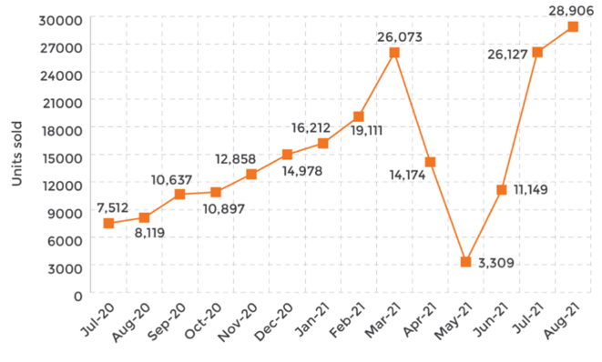 Monthly sales of electric vehicles (EVs) in India witnessed a significant year on year growth of 265% - from 8,119 units in August 2020 to 28,906 units in August 2021.