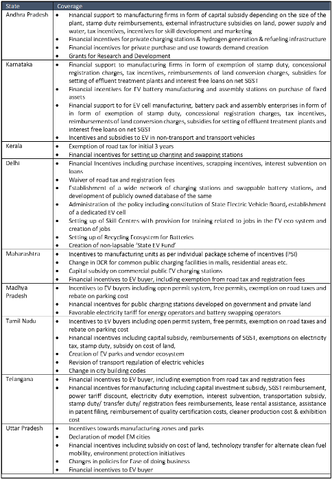 15 Indian states have policies for Electric Vehicles, either approved or notified stages, with another 6 states having a policy in ‘draft stage’. States such as Delhi, Gujarat, Maharashtra, and Meghalaya are driving incentives that are demand based (i.e. change of rules and setting of infrastructure to drive demand), while others (including the states of Andhra Pradesh, Karnataka, Tamil Nadu and Uttar Pradesh) are focusing on manufacturer led incentives (such as financial subsidies, exemptions etc.). It is expected that the states with incentives to support demand will be making infrastructural provisions for manufacturing EV or ancillary components, in a plug-and-play mode. More details on state wise policies on EV provided further in the insight.
